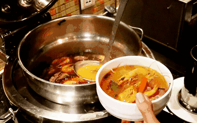 泰式冬阴功汤是泰国的“国汤”,将柠檬叶、香茅、辣椒和虾等酸辣甜咸的原料混合在一起,熬成一碗馥郁可口、色泽鲜红的汤,口感层次十分丰富。