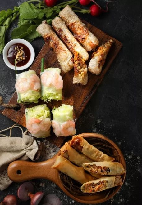 越南甘蔗虾是典型的越南菜,是把去壳的鲜虾肉剁碎,打成虾胶后,裹在甘蔗枝上置于锅里油炸而成。外皮金黄酥脆,虾肉由于吸收了甘蔗的清甜,既香又鲜、嫩、甜。吃的时候,要蘸上一点带酸辣味的泰国鸡汁。