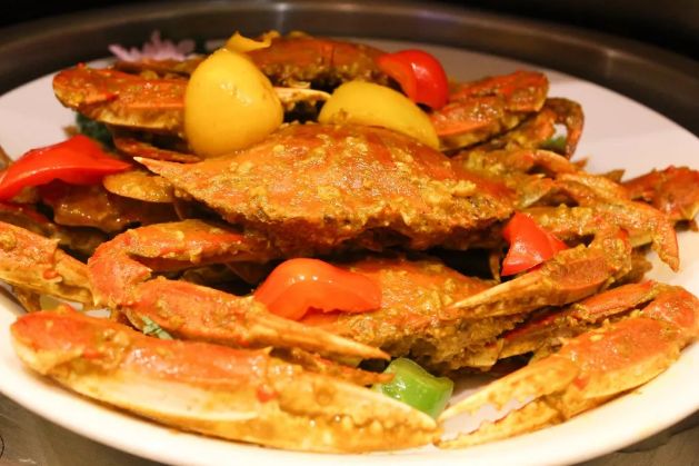 泰式绿咖喱海鲜里的绿咖喱有种辛辣与清香综合的味道,伴随浓浓椰香,切块的红蟹加上配菜与咖喱和各式香料共炒,突出海鲜的鲜味与弹性,风味独特。